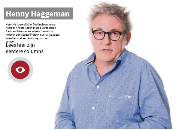 Henny is journalist in Doetinchem, maar heeft zijn roots liggen in de buurtdorpen Baak en Steenderen. Alleen daarom al moeten zijn Stadse Fratsen over alledaagse kwesties met een knipoog worden gelezen.