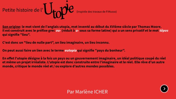Son origine: le mot vient de l'anglais utopia, mot inventé au début du XVIème siècle par Thomas Moore. Il est construit avec le préfixe grec ou- (réduit à u- sous sa forme latine) qui a un sens privatif et le mot tôpos qui signifie "lieu". C'est donc un "lieu de nulle part", un lieu imaginaire, un lieu inconnu. On peut aussi faire un lien avec le terme eutopia qui signifie "pays du bonheur". En effet l'utopie désigne à la fois un pays ou un gouvernement imaginaire, un idéal politique coupé du réel et même un projet irréaliste. L’utopie est donc construite entre l’imaginaire et le réel. Elle rêve d’un autre monde, critique le monde réel et / ou explore d’autres mondes possibles.
