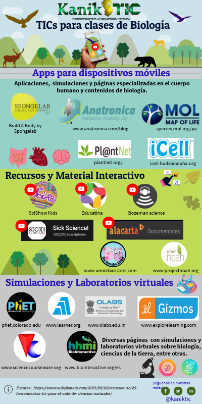 Fuentes: https://www.aulaplaneta.com/2015/09/10/recursos-tic/25-herramientas-tic-para-el-aula-de-ciencias-naturales/