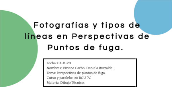 Fecha: 04-11-20Nombres: Viviana Carbo, Daniela Iturralde. Tema: Perspectivas de puntos de fuga. Curso y paralelo: 1ro BGU "A". Materia: Dibujo Técnico.