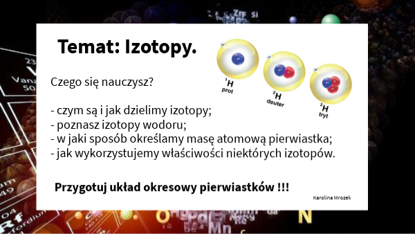 Czego się nauczysz? - czym są i jak dzielimy izotopy; - poznasz izotopy wodoru; - w jaki sposób określamy masę atomową pierwiastka; - jak wykorzystujemy właściwości niektórych izotopów.