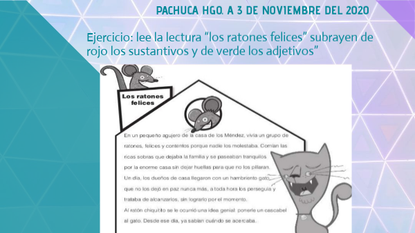 Ejercicio: lee la lectura “los ratones felices” subrayen de rojo los sustantivos y de verde los adjetivos”