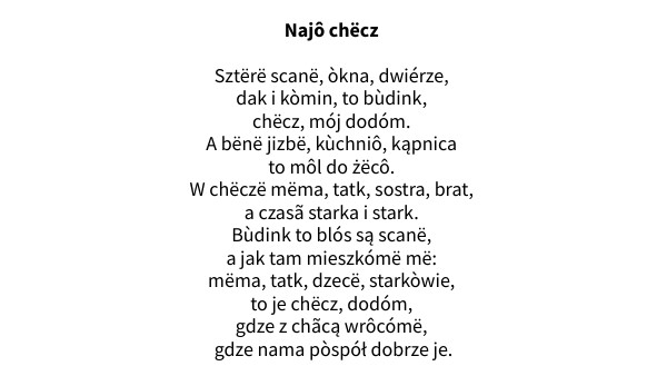 Najô chëcz Sztërë scanë, òkna, dwiérze, dak i kòmin, to bùdink, chëcz, mój dodóm. A bënë jizbë, kùchniô, kąpnica to môl do żëcô. W chëczë mëma, tatk, sostra, brat, a czasã starka i stark. Bùdink to blós są scanë, a jak tam mieszkómë më: mëma, tatk, dzecë, starkòwie, to je chëcz, dodóm, gdze z chãcą wrôcómë, gdze nama pòspół dobrze je.