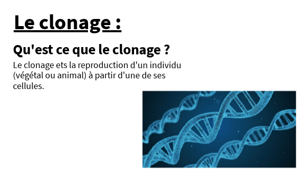 Le clonage ets la reproduction d'un individu (végétal ou animal) à partir d'une de ses cellules.