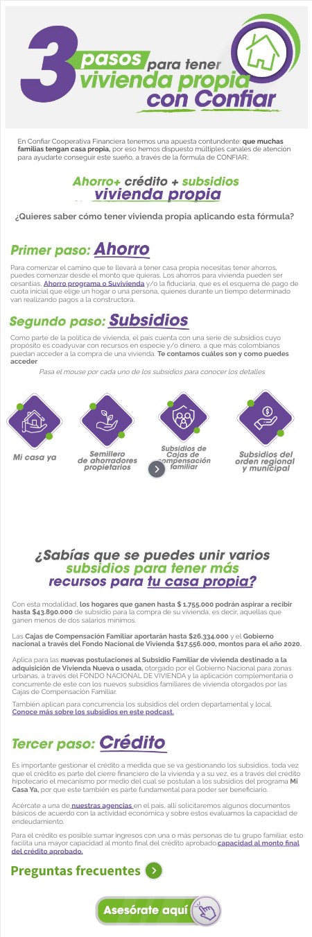 En Confiar Cooperativa Financiera tenemos una apuesta contundente: que muchas familias tengan casa propia, por eso hemos dispuesto múltiples canales de atención para ayudarte conseguir este sueño, a través de la fórmula de CONFIAR: