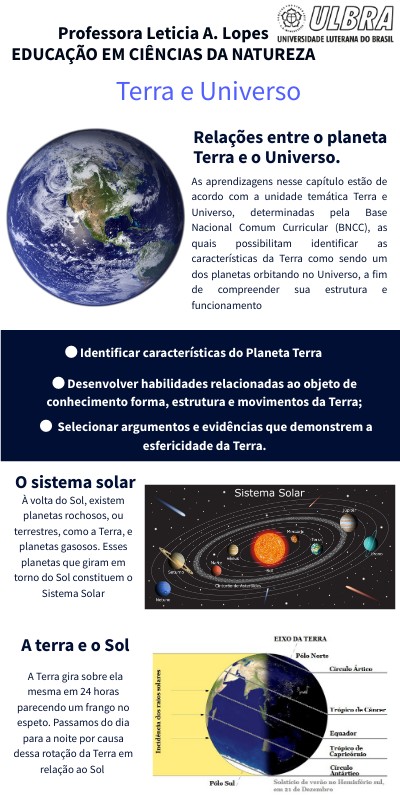 As aprendizagens nesse capítulo estão de acordo com a unidade temática Terra e Universo, determinadas pela Base Nacional Comum Curricular (BNCC), as quais possibilitam identificar as características da Terra como sendo um dos planetas orbitando no Universo, a fim de compreender sua estrutura e funcionamento