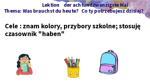 Cele : znam kolory, przybory szkolne; stosuję czasownik "haben"
