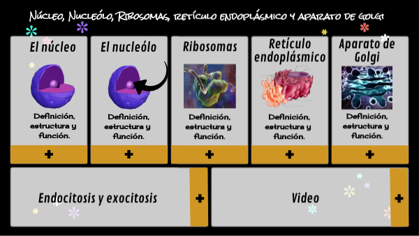 Núcleo, Nucleólo, Ribosomas, retículo endoplásmico y aparato de golgi
