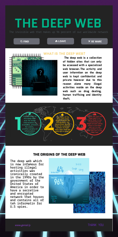The deep web is a collection of hidden sites that can only be acsessed with a specialized web browser.The activity and user informtion on the deep web is kept confidential and private however due to this reaosn alone many illegal activities reside on the deep web such as drug dealing, human trafficing and identity theft.