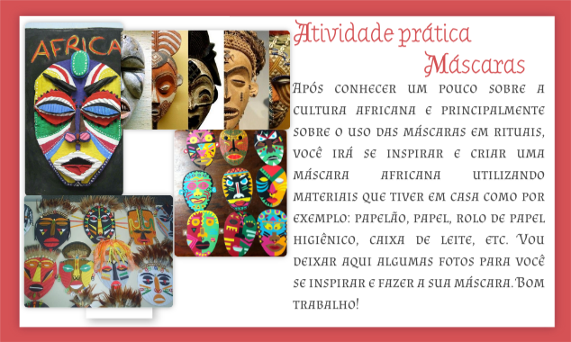 Após conhecer um pouco sobre a cultura africana e principalmente sobre o uso das máscaras em rituais, você irá se inspirar e criar uma máscara africana utilizando materiais que tiver em casa como por exemplo: papelão, papel, rolo de papel higiênico, caixa de leite, etc. Vou deixar aqui algumas fotos para você se inspirar e fazer a sua máscara. Bom trabalho!