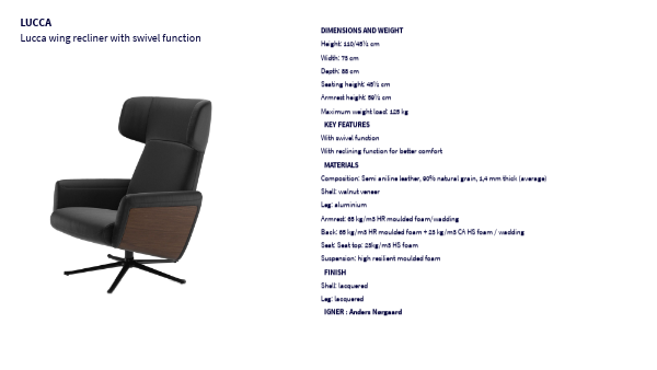 DIMENSIONS AND WEIGHT Height: 110/45½ cm Width: 73 cm Depth: 88 cm Seating height: 45½ cm Armrest height: 59½ cm Maximum weight load: 125 kg KEY FEATURES With swivel function With reclining function for better comfort MATERIALS Composition: Semi aniline leather, 90% natural grain, 1,4 mm thick (average) Shell: walnut veneer Leg: aluminium Armrest: 65 kg/m3 HR moulded foam/wadding Back: 65 kg/m3 HR moulded foam + 23 kg/m3 CA HS foam / wadding Seat: Seat top: 23kg/m3 HS foam Suspension: high resilient moulded foam FINISH Shell: lacquered Leg: lacquered IGNER : Anders Nørgaard