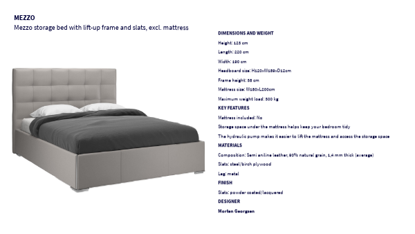 DIMENSIONS AND WEIGHT Height: 123 cm Length: 220 cm Width: 190 cm Headboard size: H120xW189xD12cm Frame height: 38 cm Mattress size: W180xL200cm Maximum weight load: 300 kg KEY FEATURES Mattress included: No Storage space under the mattress helps keep your bedroom tidy The hydraulic pump makes it easier to lift the mattress and access the storage space MATERIALS Composition: Semi aniline leather, 90% natural grain, 1,4 mm thick (average) Slats: steel/birch plywood Leg: metal FINISH Slats: powder coated/lacquered DESIGNER Morten Georgsen