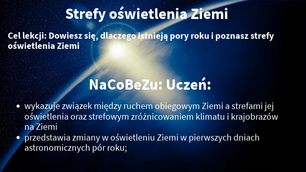 Cel lekcji: Dowiesz się, dlaczego istnieją pory roku i poznasz strefy oświetlenia Ziemi
