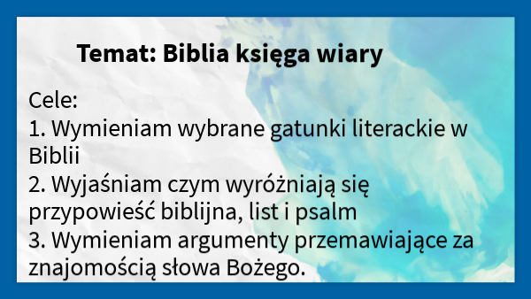 Cele: 1. Wymieniam wybrane gatunki literackie w Biblii 2. Wyjaśniam czym wyróżniają się przypowieść biblijna, list i psalm 3. Wymieniam argumenty przemawiające za znajomością słowa Bożego.