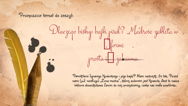 Pamiętacie Ignacego Krasickiego i jego bajki? Mam nadzieję, że tak... Przed nami (już niedługo) „Żona modna”, której autorem jest Krasicki. Jest to nasza lektura obowiązkowa. Zanim do niej przejdziemy, czeka nas mała powtórka...