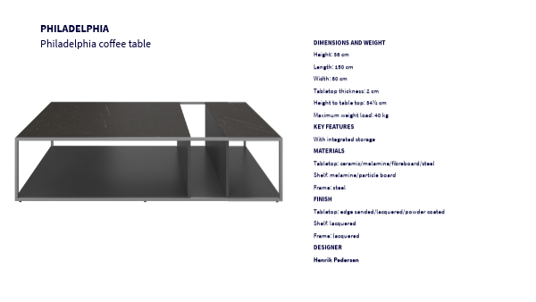DIMENSIONS AND WEIGHT Height: 36 cm Length: 150 cm Width: 80 cm Tabletop thickness: 2 cm Height to table top: 34½ cm Maximum weight load: 40 kg KEY FEATURES With integrated storage MATERIALS Tabletop: ceramic/melamine/fibreboard/steel Shelf: melamine/particle board Frame: steel FINISH Tabletop: edge sanded/lacquered/powder coated Shelf: lacquered Frame: lacquered DESIGNER Henrik Pedersen
