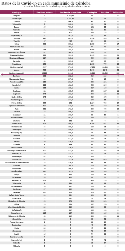 Datos de la Covid-19 en cada municipio de Córdoba extraídos del IECA