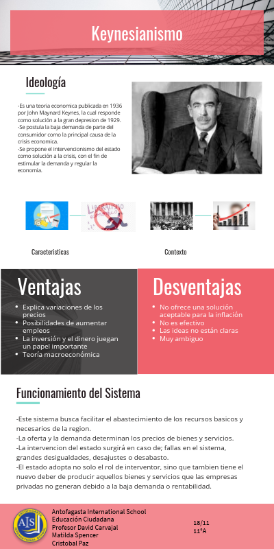 -Es una teoria economica publicada en 1936 por John Maynard Keynes, la cual responde como solución a la gran depresion de 1929.-Se postula la baja demanda de parte del consumidor como la principal causa de la crisis economica.-Se propone el intervencionismo del estado como solución a la crisis, con el fin de estimular la demanda y regular la economia.