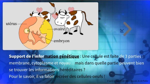 Support de l'information génétique : Une cellule est faite de 3 parties : membrane, cytoplasme et noyau... mais dans quelle partie peuvent bien se trouver les informations héréditaires ?Pour le savoir, il va faloir recréer des cellules-oeufs !