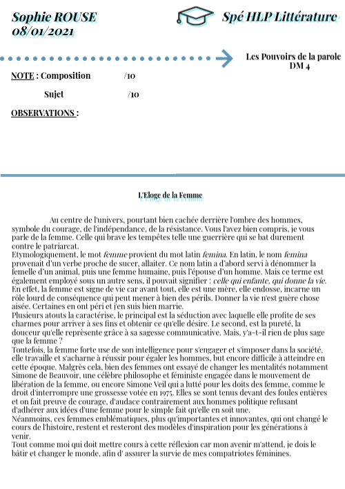 Au centre de l'univers, pourtant bien cachée derrière l'ombre des hommes, symbole du courage, de l'indépendance, de la résistance. Vous l'avez bien compris, je vous parle de la femme. Celle qui brave les tempêtes telle une guerrière qui se bat durement contre le patriarcat. Etymologiquement, le mot femme provient du mot latin femina. En latin, le nom femina provenait d’un verbe proche de sucer, allaiter. Ce nom latin a d’abord servi à dénommer la femelle d’un animal, puis une femme humaine, puis l’épouse d’un homme. Mais ce terme est également employé sous un autre sens, il pouvait signifier : celle qui enfante, qui donne la vie. En effet, la femme est signe de vie car avant tout, elle est une mère, elle endosse, incarne un rôle lourd de conséquence qui peut mener à bien des périls. Donner la vie n'est guère chose aisée. Certaines en ont péri et j'en suis bien marrie. Plusieurs atouts la caractérise, le principal est la séduction avec laquelle elle profite de ses charmes pour arriver à ses fins et obtenir ce qu'elle désire. Le second, est la pureté, la douceur qu'elle reprèsente grâce à sa sagesse communicative. Mais, y'a-t-il rien de plus sage que la femme ? Toutefois, la femme forte use de son intelligence pour s'engager et s'imposer dans la société, elle travaille et s'acharne à réussir pour égaler les hommes, but encore difficile à atteindre en cette époque. Malgrès cela, bien des femmes ont essayé de changer les mentalités notamment Simone de Beauvoir, une célèbre philosophe et féministe engagée dans le mouvement de libération de la femme, ou encore Simone Veil qui a lutté pour les doits des femme, comme le droit d'interrompre une grossesse votée en 1975. Elles se sont tenus devant des foules entières et on fait preuve de courage, d'audace contrairement aux hommes politique refusant d'adhérer aux idées d'une femme pour le simple fait qu'elle en soit une. Néanmoins, ces femmes emblématiques, plus qu'importantes et innovantes, qui ont changé le cours de l'histoire, restent et resteront des modèles d'inspiration pour les générations à venir. Tout comme moi qui doit mettre cours à cette réflexion car mon avenir m'attend, je dois le bâtir et changer le monde, afin d' assurer la survie de mes compatriotes féminines.