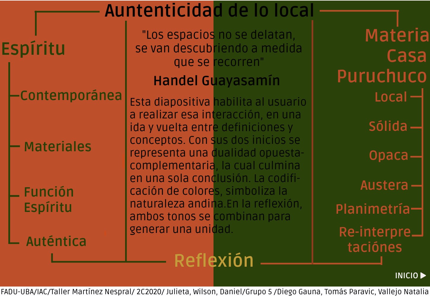 Esta diapositiva habilita al usuario a realizar esa interacción, en una ida y vuelta entre definiciones y conceptos. Con sus dos inicios se representa una dualidad opuesta-complementaria, la cual culmina en una sola conclusión. La codifi- cación de colores, simboliza la naturaleza andina.En la reflexión, ambos tonos se combinan para generar una unidad.