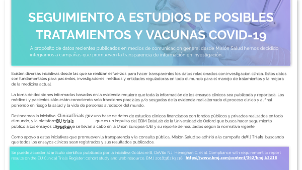 Existen diversas iniciativas desde las que se realizan esfuerzos para hacer transparentes los datos relacionados con investigación clínica. Estos datos son fundamentales para pacientes, investigadores, médicos y entidades reguladoras en todo el mundo para el manejo de tratamientos y la mejora de la medicina actual. La toma de decisiones informadas basadas en la evidencia requiere que toda la información de los ensayos clínicos sea publicada y reportada. Los médicos y pacientes sólo están conociendo solo fracciones parciales y/o sesgadas de la evidencia real alternado el proceso clínico y al final poniendo en riesgo la salud y la vida de personas alrededor del mundo. Destacamos la iniciativa una base de datos de estudios clínicos financiados con fondos públicos y privados realizados en todo el mundo, y la plataforma que es un impulso del EBM DataLab de la Universidad de Oxford que busca hacer seguimiento público a los ensayos clínicos que se llevan a cabo en la Unión Europea (UE) y su reporte de resultados según la normativa vigente. Como apoyo a estas iniciativas que promueven la transparencia y la consulta pública, Misión Salud se adhirió a la campaña de buscando que todos los ensayos clínicos sean registrados y sus resultados publicados. Se puede acceder al artículo científico publicado por la iniciativa Goldacre B, DeVito NJ, Heneghan C, et al. Compliance with requirement to report results on the EU Clinical Trials Register: cohort study and web resource. BMJ 2018;362:k3218.