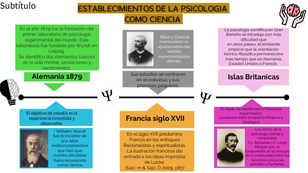 Surgio alrededor de 1880 como dos (2) fuentes: • DIsciplina practica: trato de colaborar con otras disciplinas. • Rama de la filosofia: Los filósofos intentaban explicar las funciones del alma