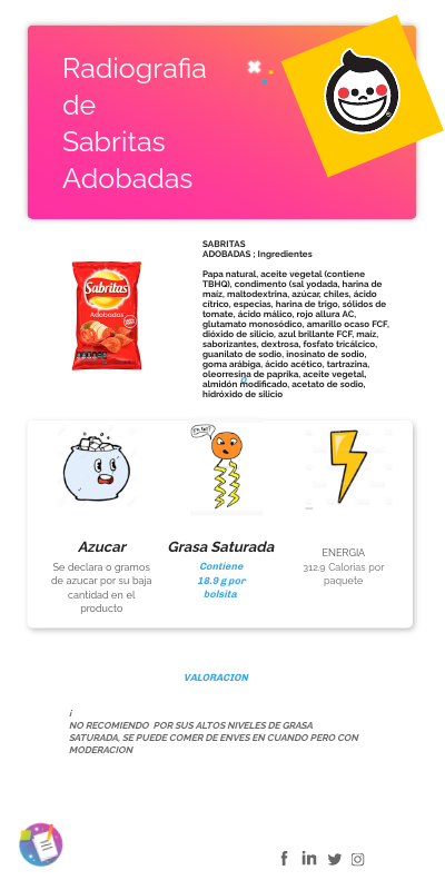 SABRITASADOBADAS ; Ingredientes Papa natural, aceite vegetal (contiene TBHQ), condimento (sal yodada, harina de maíz, maltodextrina, azúcar, chiles, ácido cítrico, especias, harina de trigo, sólidos de tomate, ácido málico, rojo allura AC, glutamato monosódico, amarillo ocaso FCF, dióxido de silicio, azul brillante FCF, maíz, saborizantes, dextrosa, fosfato tricálcico, guanilato de sodio, inosinato de sodio, goma arábiga, ácido acético, tartrazina, oleorresina de paprika, aceite vegetal, almidón modificado, acetato de sodio, hidróxido de silicio