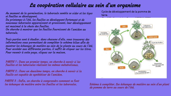 Au moment de la germination, le tubercule semble se vider et les tiges et feuilles se développent. Du printemps à l'été, les feuilles se développent fortement et de nouveaux tubercules apparaissent et grossissent, leur développement est maximal à la chute des feuilles. On cherche à montrer que les feuilles fournissent de l’amidon au tubercule. Trois parties sont à étudier, dans chacune d'elle, vous trouverez des informations vous permettant de compléter le schéma bilan afin de montrer les échanges de matière au sein de la plante au cours de l’été. Pour accéder aux différentes parties, il suffit de cliquer sur les titres. Pour revenir à cette page, cliquez sur la maison.