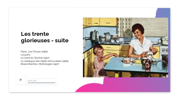 Perec, Les Choses (1965)L'OuLiPo Le chant du Styrène (1957) Le catalogue des objets introuvables (1969) Roland Barthes, Mythologies (1957)