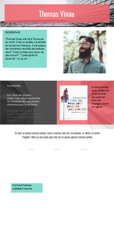 BIOGRAPHIE Thomas Vinau est né à Toulouse, en 1978. C'est un poète, novelliste et romancier français. Il est auteur de nombreux recueils de poésies dont "c'est un beau jour pour ne pas mourir", "juste après la pluie"et " ici ça va" ...