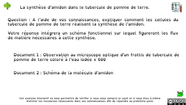 Question : A l’aide de vos connaissances, expliquer comment les cellules du tubercule de pomme de terre réalisent la synthèse de l’amidon. Votre réponse intégrera un schéma fonctionnel sur lequel figureront les flux de matière nécessaires à cette synthèse.