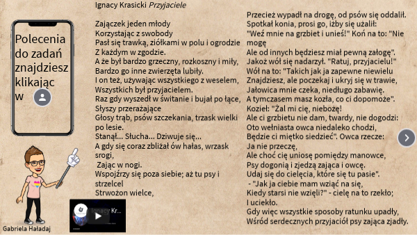 Zajączek jeden młody Korzystając z swobody Pasł się trawką, ziółkami w polu i ogrodzie Z każdym w zgodzie. A że był bardzo grzeczny, rozkoszny i miły, Bardzo go inne zwierzęta lubiły. I on też, używając wszystkiego z weselem, Wszystkich był przyjacielem. Raz gdy wyszedł w świtanie i bujał po łące, Słyszy przerażające Głosy trąb, psów szczekania, trzask wielki po lesie. Stanął... Słucha... Dziwuje się... A gdy się coraz zbliżał ów hałas, wrzask srogi, Zając w nogi. Wspojźrzy się poza siebie; aż tu psy i strzelcel Strwożon wielce,