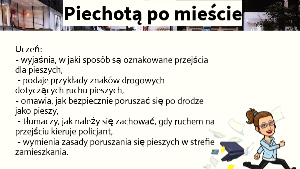 Uczeń: − wyjaśnia, w jaki sposób są oznakowane przejścia dla pieszych, − podaje przykłady znaków drogowych dotyczących ruchu pieszych, − omawia, jak bezpiecznie poruszać się po drodze jako pieszy, − tłumaczy, jak należy się zachować, gdy ruchem na przejściu kieruje policjant, − wymienia zasady poruszania się pieszych w strefie zamieszkania.