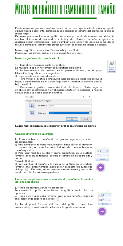 Puede mover un gráfico a cualquier ubicación de una hoja de cálculo o a una hoja de cálculo nueva o existente. También puede cambiar el tamaño del gráfico para que se ajuste mejor. De forma predeterminada, un gráfico se mueve y cambia de tamaño con celdas. Al cambiar el tamaño de las celdas de la hoja de cálculo, el tamaño del gráfico se ajustará según corresponda. Puede cambiar esta opción de posición si no desea mover o cambiar el tamaño del gráfico junto con las celdas de la hoja de cálculo. Mover un gráfico a otra ubicación en una hoja de cálculo Para mover un gráfico, arrástrelo a la ubicación que desee.
