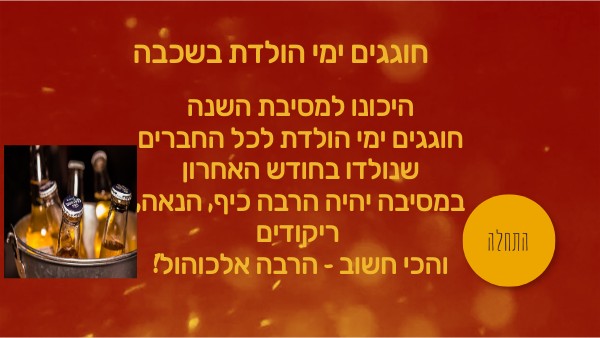 היכונו למסיבת השנה חוגגים ימי הולדת לכל החברים שנולדו בחודש האחרון במסיבה יהיה הרבה כיף, הנאה, ריקודים !והכי חשוב - הרבה אלכוהול