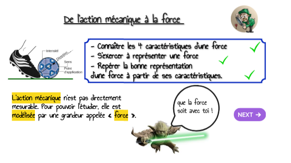 - Connaître les 4 caractéristiques d'une force - S'exercer à représenter une force - Repérer la bonne représentation d'une force à partir de ses caractéristiques.