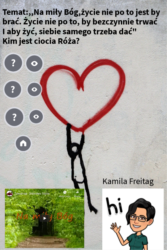 Temat:,,Na miły Bóg,życie nie po to jest by brać. Życie nie po to, by bezczynnie trwać I aby żyć, siebie samego trzeba dać" Kim jest ciocia Róża?