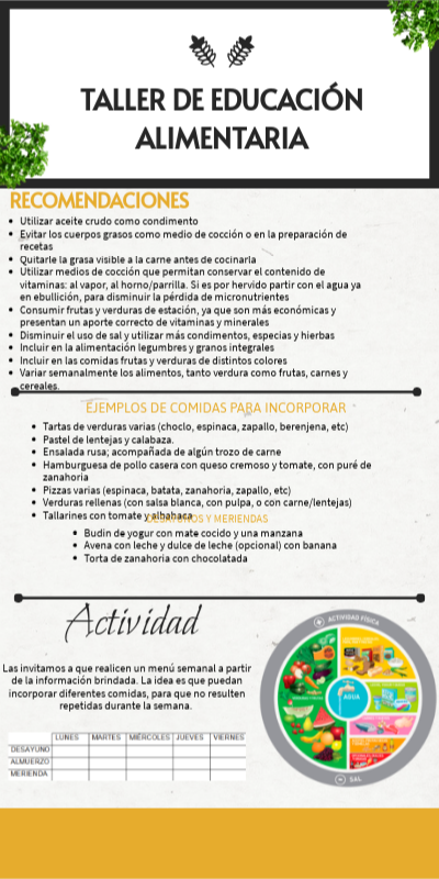 Las invitamos a que realicen un menú semanal a partir de la información brindada. La idea es que puedan incorporar diferentes comidas, para que no resulten repetidas durante la semana.