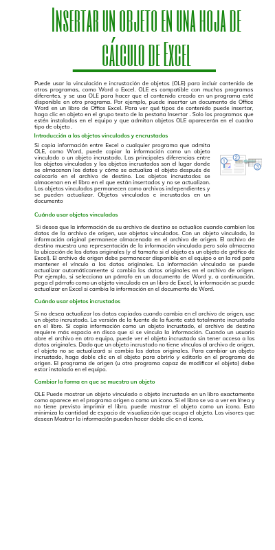 Cuándo usar objetos vinculados Si desea que la información de su archivo de destino se actualice cuando cambien los datos de la archivo de origen, use objetos vinculados. Con un objeto vinculado, la información original permanece almacenada en el archivo de origen. El archivo de destino muestra una representación de la información vinculada pero solo almacena la ubicación de los datos originales (y el tamaño si el objeto es un objeto de gráfico de Excel). El archivo de origen debe permanecer disponible en el equipo o en la red para mantener el vínculo a los datos originales. La información vinculada se puede actualizar automáticamente si cambia los datos originales en el archivo de origen. Por ejemplo, si selecciona un párrafo en un documento de Word y, a continuación, pega el párrafo como un objeto vinculado en un libro de Excel, la información se puede actualizar en Excel si cambia la información en el documento de Word. Cuándo usar objetos incrustados Si no desea actualizar los datos copiados cuando cambia en el archivo de origen, use un objeto incrustado. La versión de la fuente de la fuente está totalmente incrustada en el libro. Si copia información como un objeto incrustado, el archivo de destino requiere más espacio en disco que si se vincula la información. Cuando un usuario abre el archivo en otro equipo, puede ver el objeto incrustado sin tener acceso a los datos originales. Dado que un objeto incrustado no tiene vínculos al archivo de origen, el objeto no se actualizará si cambia los datos originales. Para cambiar un objeto incrustado, haga doble clic en el objeto para abrirlo y editarlo en el programa de origen. El programa de origen (u otro programa capaz de modificar el objeto) debe estar instalado en el equipo. Cambiar la forma en que se muestra un objeto OLE Puede mostrar un objeto vinculado o objeto incrustado en un libro exactamente como aparece en el programa origen o como un icono. Si el libro se va a ver en línea y no tiene previsto imprimir el libro, puede mostrar el objeto como un icono. Esto minimiza la cantidad de espacio de visualización que ocupa el objeto. Los visores que deseen Mostrar la información pueden hacer doble clic en el icono.