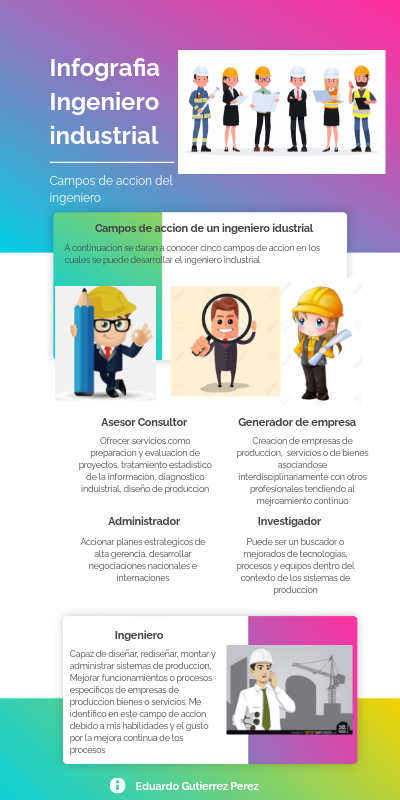 Capaz de diseñar, rediseñar, montar y administrar sistemas de produccion, Mejorar funcionamientos o procesos especificos de empresas de produccion bienes o servicios. Me identifico en este campo de accion debido a mis habilidades y el gusto por la mejora continua de los procesos