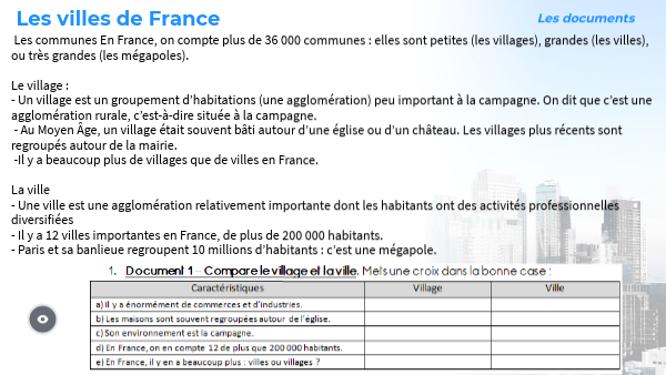 Les communes En France, on compte plus de 36 000 communes : elles sont petites (les villages), grandes (les villes), ou très grandes (les mégapoles). Le village : - Un village est un groupement d’habitations (une agglomération) peu important à la campagne. On dit que c’est une agglomération rurale, c’est-à-dire située à la campagne. - Au Moyen Âge, un village était souvent bâti autour d’une église ou d’un château. Les villages plus récents sont regroupés autour de la mairie. -Il y a beaucoup plus de villages que de villes en France. La ville - Une ville est une agglomération relativement importante dont les habitants ont des activités professionnelles diversifiées - Il y a 12 villes importantes en France, de plus de 200 000 habitants. - Paris et sa banlieue regroupent 10 millions d’habitants : c’est une mégapole.