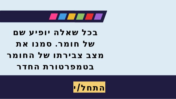 בכל שאלה יופיע שם של חומר. סמנו את מצב צבירתו של החומר בטמפרטורת החדר
