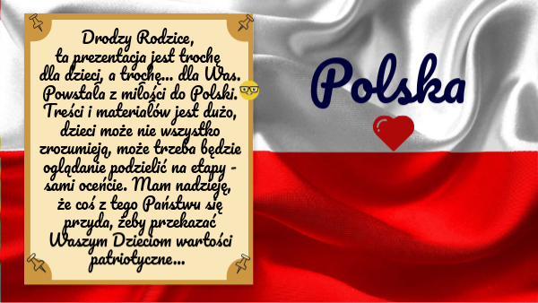 Drodzy Rodzice, ta prezentacja jest trochę dla dzieci, a trochę... dla Was. Powstała z miłości do Polski. Treści i materiałów jest dużo, dzieci może nie wszystko zrozumieją, może trzeba będzie oglądanie podzielić na etapy - sami oceńcie. Mam nadzieję, że coś z tego Państwu się przyda, żeby przekazać Waszym Dzieciom wartości patriotyczne...