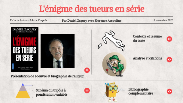 Par ce livre publié en 2008, Daniel Zagury entend démysthifier les tueurs en série en présentant des éléments de réponse à la question centrale : qu'est-cequi pousse certains hommes à commettre des horrreurs et à recommencer encore et encore ? Loin des présentations fantasmées par l'opinion public, Daniel Zagury amène le lecteur à s'interroger sur les processus cliniques qui sont à l'oeuvre à partir des hommes qu'il a eu à expertiser dans le cadre de son travail.