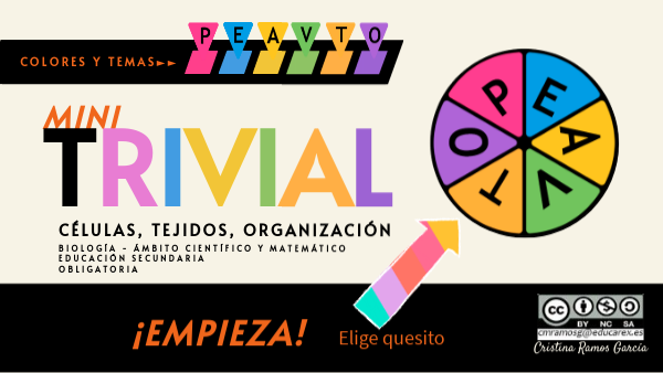 Juego con seis preguntas sobre: células procariotas (P), eucariotas (E), animal (A), vegetal (V), tejidos (T) y niveles de organización (O). Incluye tres infografías originales y enlaces a Wikipedia para completar el aprendizaje.