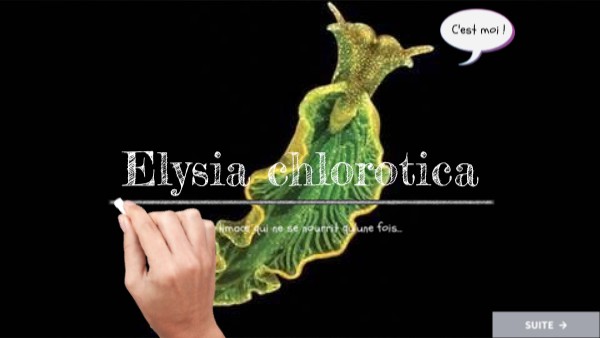 Elysia chlorotica est une limace de mer ayant la forme d’une feuille verdâtre. Sa couleur verte apparaît au cours du passage de la forme larvaire à la forme adulte juvénile en consommant des filaments d’une algue, Vaucheria littorea. Ce repas sera alors son seul et unique repas de sa vie, dont le temps est de 10 mois tout de même !