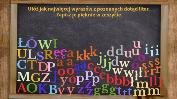 Ułóż jak najwięcej wyrazów z poznanych dotąd liter. Zapisz je pięknie w zeszycie.