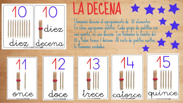 Llamamos decena al agrupamiento de 10 elementos. En clase agrupamos palillos. Cada grupo de palilllos con una gomita, es una decena. Los llamamos la familia del 10 y todos tienen 1 decena. Al resto de palillos sueltos, le llamamos unidades.
