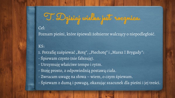 Cel:Poznam pieśni, które śpiewali żołnierze walczący o niepodległość. KS: 1. Potrafię zaśpiewać „Rotę”, „Piechotę” i „Marsz I Brygady”: - Śpiewam czysto (nie fałszuję). - Utrzymuję właściwe tempo i rytm. - Stoję prosto, z odpowiednią postawą ciała. - Zwracam uwagę na słowa – wiem, o czym śpiewam. - Śpiewam z dumą i powagą, okazując szacunek dla pieśni i jej treści.
